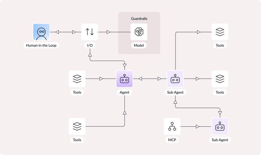 Agent - This is an agent that can perform specific tasks, it is connected to an application which is connected to a model. The agent always has a system prompt, sometimes has tools or is connected to an MCP. Additionally, an Agent can act as a Sub Agent so its important to map if this agent is triggered within a scope of another agent, finally an agent can have a “Human in the Loop” property where a human can or has to intervene during the agent operations. This entity contains the following properties: System Prompt , Tools, MCP, Scope, Human In the Loop.