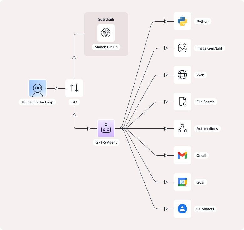 System Prompt: Controls instructions and ensures compliance.Tools:Python sandbox (code execution, data analysis)Image generation/editingWeb access (search, open URLs)File search (internal docs if connected)Automations (reminders, checks)Gmail, GCal, GContacts (read/search only)