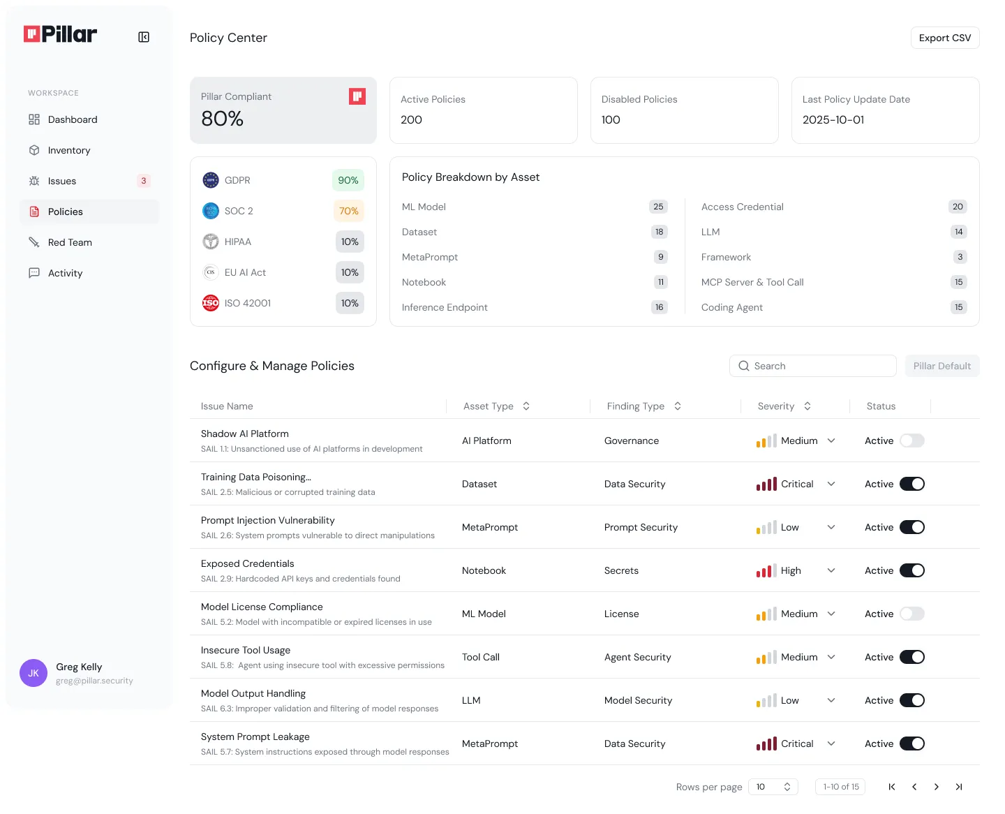 Pillar's AI Discovery automatically identifies and catalogs all AI assets across your organization—from models and training pipelines to libraries, meta-prompts, MCP servers, agentic frameworks and datasets. By integrating with code repositories, data platforms, and AI/ML infrastructure, Pillar continuously scans and maintains a real-time inventory of your entire AI footprint, capturing the AI-specific components that traditional code scanners and DevSecOps tools miss.