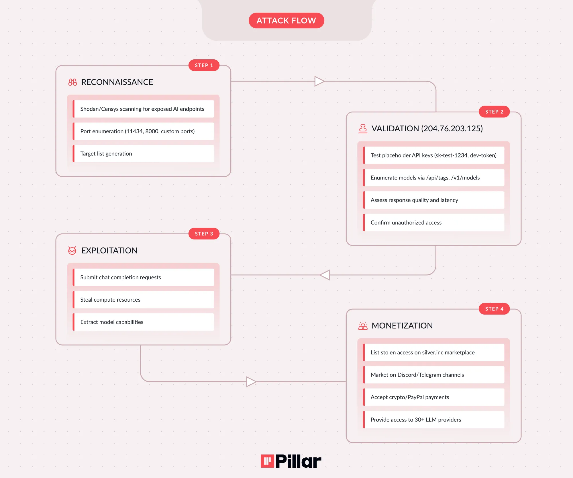 The Scanner: A distributed bot infrastructure systematically probes the internet for exposed AI endpoints. Every exposed Ollama instance, every unauthenticated vLLM server, every accessible MCP endpoint gets cataloged.